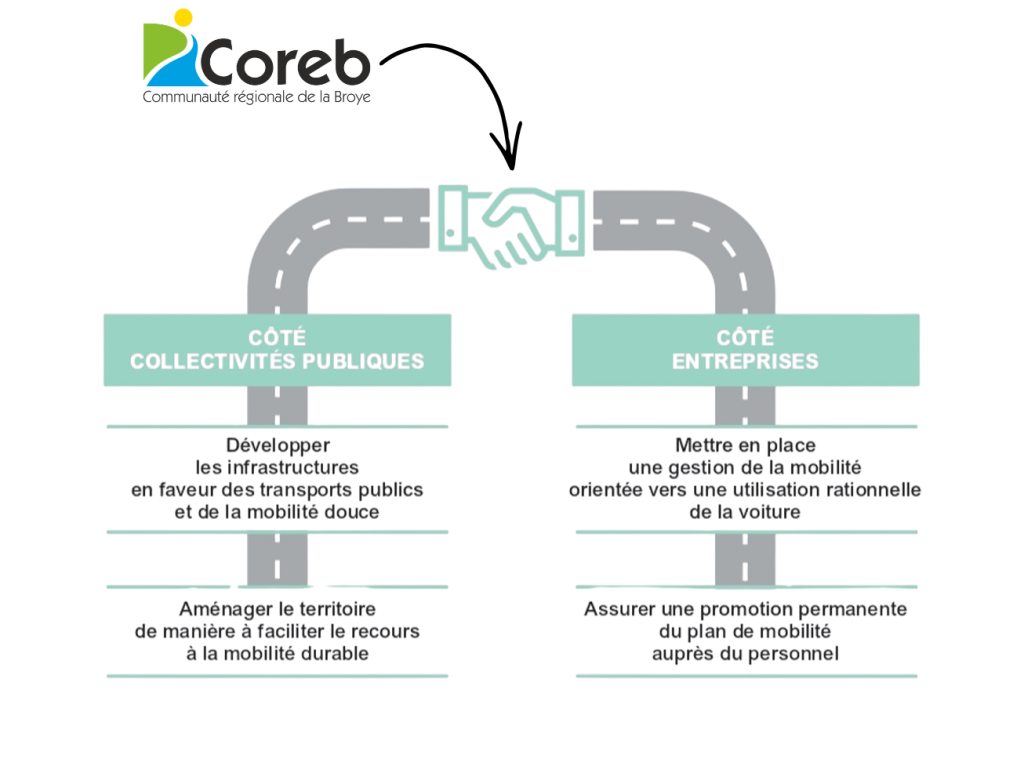 Dans le cadre de son domaine d’activité stratégique Mobilité, la COREB a comme objectif général de susciter et accompagner le report modal de la population. L’une des actions en ce sens consiste à soutenir et accompagner les entreprises de la Broye dans le domaine des plans de mobilité.